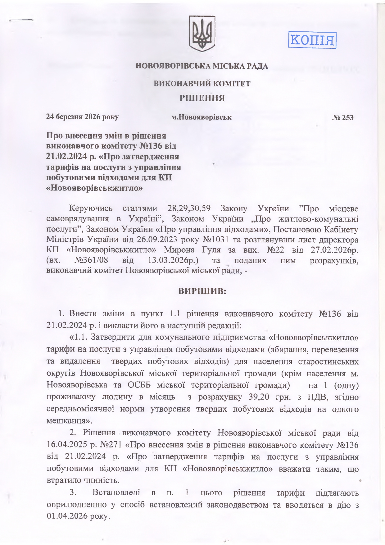 РІШЕННЯ ЩОДО ВСТАНОВЛЕННЯ / КОРИГУВАННЯ ТАРИФІВ